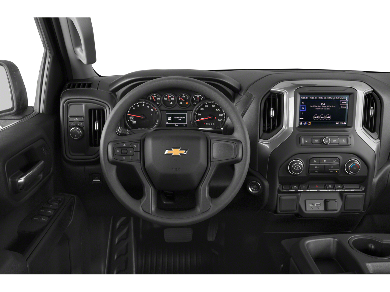 ENGINE, 5.3L ECOTEC3 V8 (355 hp [265 kW] @ 5600 rpm, 383 lb-ft of torque [518 Nm] @ 4100 rpm); featuring available Dynamic Fuel Management that enables the engine to operate in 17 different patterns between 2 and 8 cylinders, depending on demand, to optimize power delivery and efficiency, WT SAFETY PACKAGE includes (UD7) Rear Park Assist, (UKC) Lane Change Alert with Side Blind Zone Alert, (UFB) Rear Cross Traffic Alert-Braking, (UKK) Rear Pedestrian Alert, (V46) Chrome front bumper, (VJH) Chrome rear bumper and (DP6) high gloss Black mirror caps (Certain vehicles built prior to 7-11-22 may be forced to include (00Y) Not Equipped with Rear Park Assist, which removes Rear Park Assist. See dealer for details or the window label for the features on a specific vehicle. Vehicles built on or after 7-11-22 will include (UD7) Rear Park assist. Includes (UD7) Rear Park Assist and (U12) Perimeter Lighting. Includes (V76) recovery hooks. WT CONVENIENCE PACKAGE includes (AKO) tinted windows, (C49) rear-window defogger, (K34) cruise control and (DLF) power mirrors, AUTO-LOCKING REAR DIFFERENTIAL, WHEELS, 17" X 8" (43.2 CM X 20.3 CM) BRIGHT SILVER PAINTED ALUMINUM, GLASS, DEEP-TINTED, MIRRORS, OUTSIDE HEATED POWER-ADJUSTABLE When (PQA) WT Safety Package is ordered, includes (DP6) high gloss Black mirror caps.), AUDIO SYSTEM, CHEVROLET INFOTAINMENT 3 SYSTEM 7" diagonal color touchscreen, AM/FM stereo. Additional features for compatible phones include: Bluetooth® audio streaming for 2 active devices, voice command pass-through to phone, wired Apple CarPlay® and Android Auto® capable. (STD), TRANSMISSION, 10-SPEED AUTOMATIC, ELECTRONICALLY CONTROLLED with overdrive and tow/haul mode. Includes Cruise Grade Braking and Powertrain Grade Braking. Chevrolet Work Truck with SUMMIT WHITE exterior and JET BLACK interior features a 8 Cylinder Engine with 310 HP at 5600 RPM*.