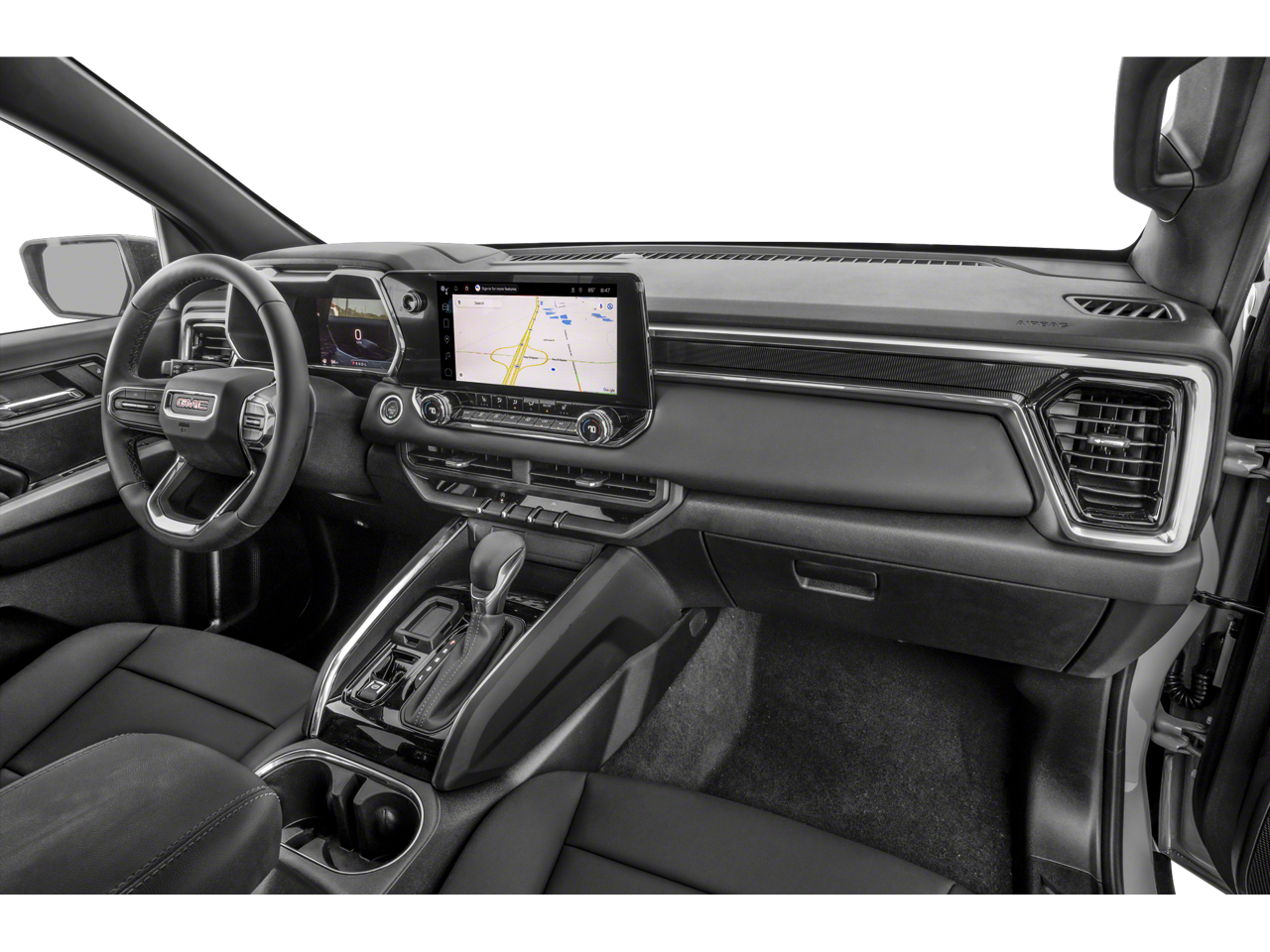 CONVENIENCE PACKAGE includes (DEG) Driver and front passenger sliding visor with illuminated vanity mirrors, (C49) rear window electric defogger, (T40) LED front fog lamps, (CJ2) dual zone automatic climate control, (KI6) 120-volt power outlet rear of console, (KC9) 120-volt bed-mounted power outlet, (BTV) Remote Start, (DD8) inside rear view auto-dimming mirror, (A28) rear sliding manual window, (N37) manual tilt/telescoping steering column, (UBI) 2-USB Charge Only, rear of console, (BDR) Tailgate keyed cylinder lock, (BPC) MultiStow Tailgate, (C75) Front interior courtesy light with dual reading light, (DLF) outside heated power mirrors and (PPA) EZ-Lift and Lower tailgate, TECHNOLOGY PACKAGE includes (UKK) Rear Pedestrian Alert, (KSG) Adaptive Cruise Control, (UV2) HD Surround Vision (Includes (BDR) Tailgate keyed cylinder lock. TRAILERING PACKAGE includes trailer hitch and 7-pin connector (Includes (JL1) Trailer brake controller. CANYON SAFETY PLUS PACKAGE includes (UD7) Rear Park Assist, (UFB) Rear Cross Traffic Braking and (UKI) Blind Zone Steering Assist, DIFFERENTIAL, AUTOMATIC LOCKING REAR, ENGINE, 2.7L TURBO HIGH-OUTPUT (GM Estimated 310 hp [231 kW] @ 5600 rpm, GM Estimated 430 lb-ft of torque [583 Nm] @ 3000 rpm) (STD), TRANSMISSION, 8-SPEED AUTOMATIC, 8L80 (STD). GMC 4WD Elevation with Onyx Black exterior and Jet Black interior features a 4 Cylinder Engine with 310 HP at 5600 RPM*.
